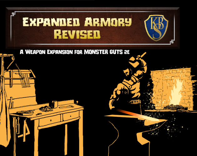 Expanded Armory Revised is ©2026 Kaid Brenen Sacander. It features content originally made for the first edition of MONSTER GUTS that has been remastered and revised to be compatible with the second edition.